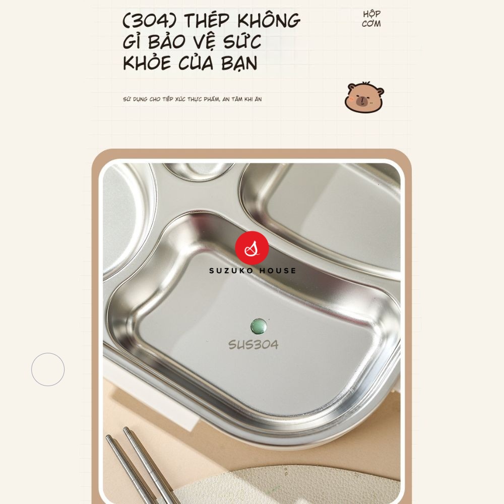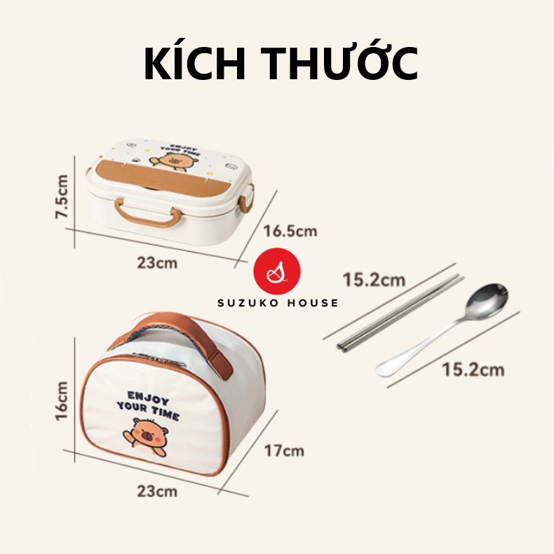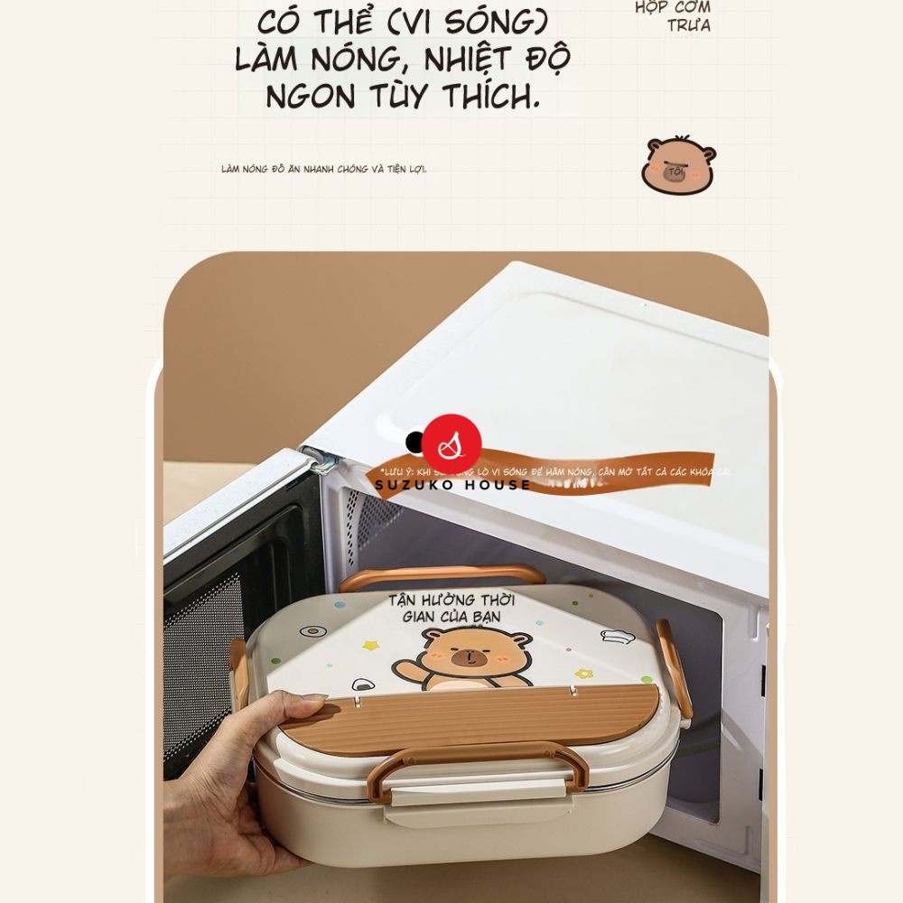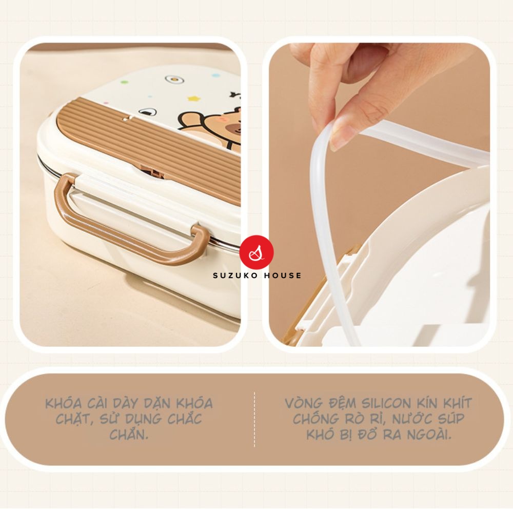 Hộp cơm văn phòng gấu cute đựng đồ ăn SUZUKO HOUSE, Hộp giữ nhiệt inox 304 2 ngăn 850ml quay lò vi sóng HC12