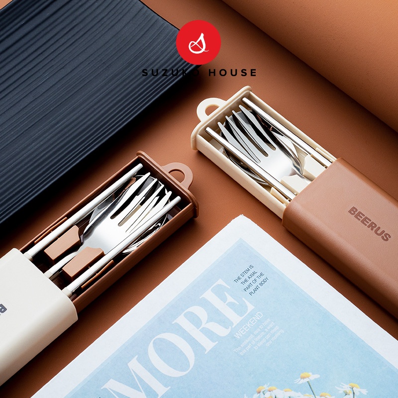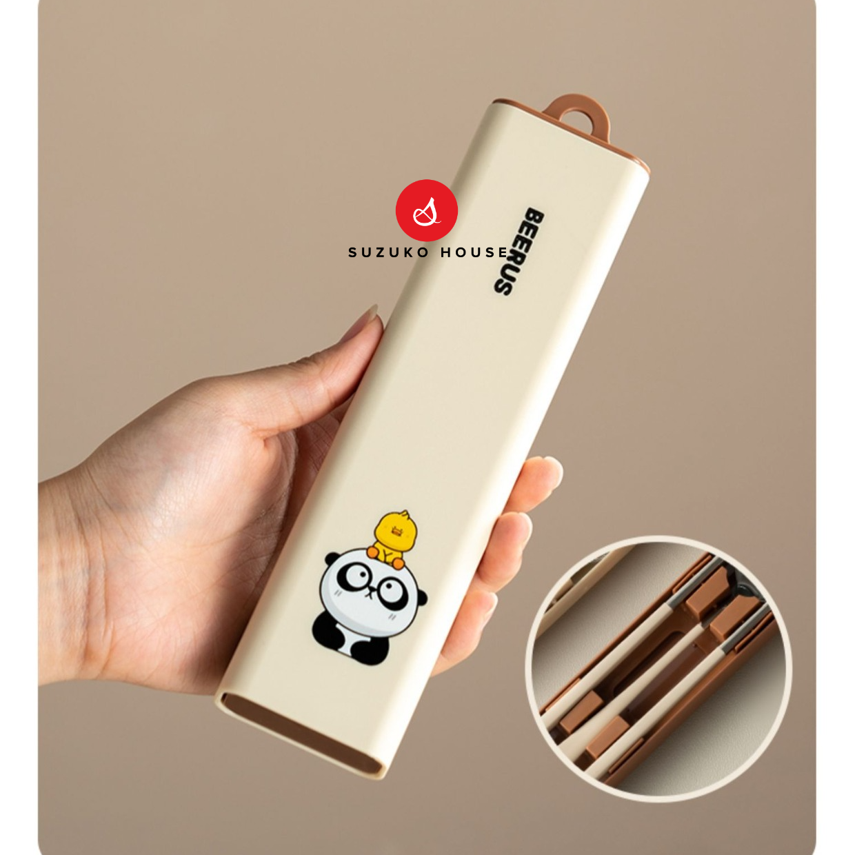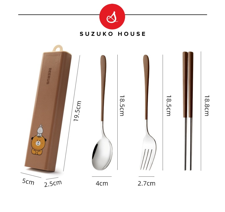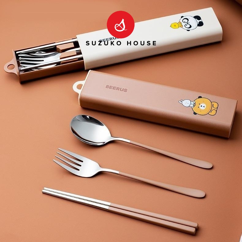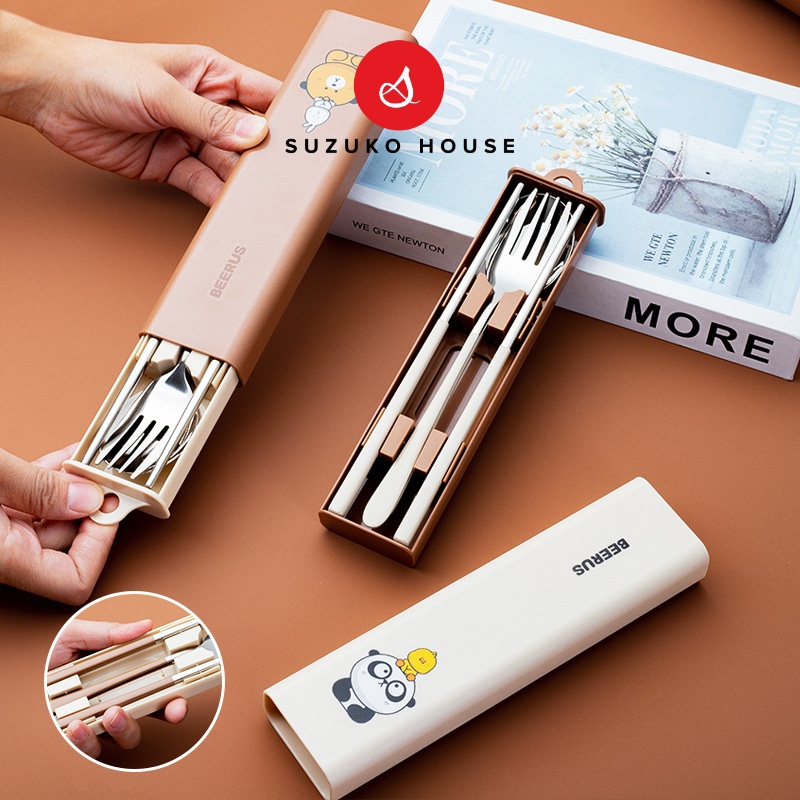 Hộp đũa thìa văn phòng cute Bear SUZUKO HOUSE, Bộ thìa đũa cá nhân INOX 304 nắp đậy dễ thương set thìa dĩa cho bé TM06