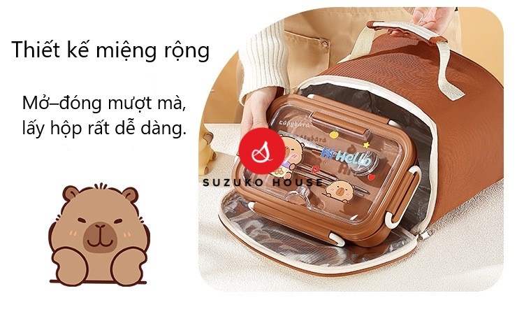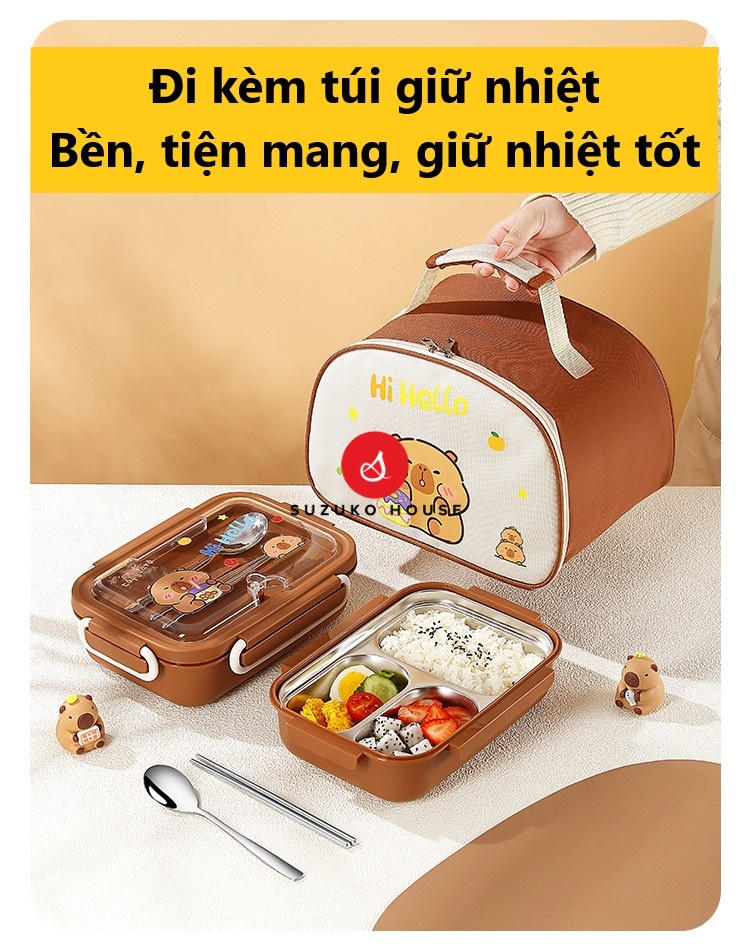 6. **Tặng kèm bộ phụ kiện tiện lợi:** Hộp đi kèm với bộ muỗng và đũa inox nhỏ gọn cùng túi giữ nhiệt cao cấp. Túi giữ nhiệt được thiết kế dày dặn với tay cầm chắc chắn để bạn có thể mang theo dễ dàng.
