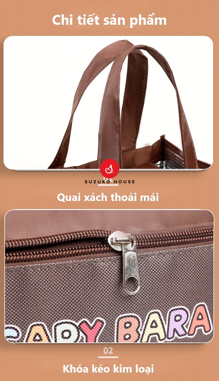 Chi tiết chắc chắn: Quai xách dày dặn, dễ cầm, khó biến dạng; khóa kéo kim loại trơn tru, bền bỉ.