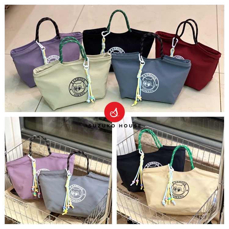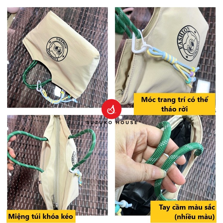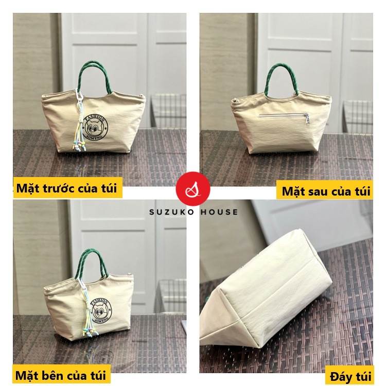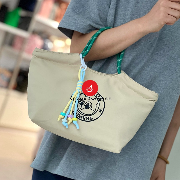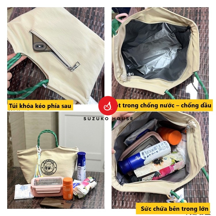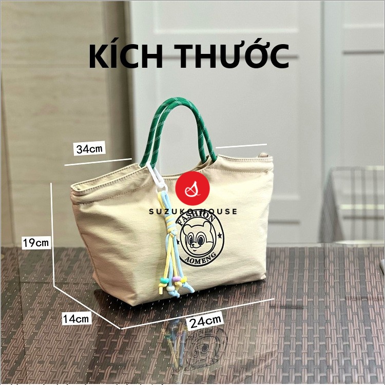 Túi còn có móc treo trang trí tháo rời, tạo điểm nhấn dễ thương nhưng vẫn phù hợp môi trường công sở. Quai xách bản to chắc chắn, chịu lực tốt khi mang hộp cơm nặng. Form túi rộng, sức chứa lớn với kích thước đáy 24 × 14 × 19 cm và miệng túi rộng 34 cm, đựng được 1–2 hộp cơm, bình nước 700ml và nhiều phụ kiện khác.