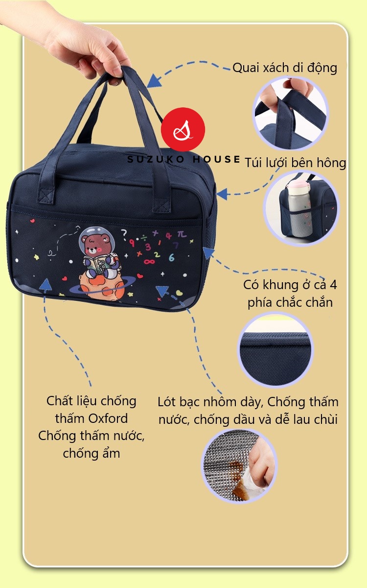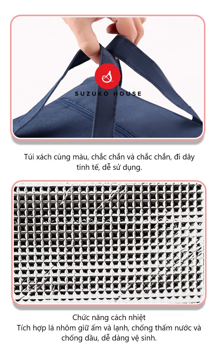 Túi đựng hộp cơm văn phòng size lớn, SUZUKO HOUSE túi giữ nhiệt đựng cơm lót bạc vải chống thấm nước dễ thương không chỉ chú trọng đến tính năng mà còn đến yếu tố thẩm mỹ. Bạn có thể dễ dàng tìm thấy một chiếc túi cơm phù hợp với phong cách cá nhân của mình. Những mẫu túi cơm dễ thương, đáng yêu sẽ giúp bạn thêm phần vui vẻ và thoải mái khi sử dụng.