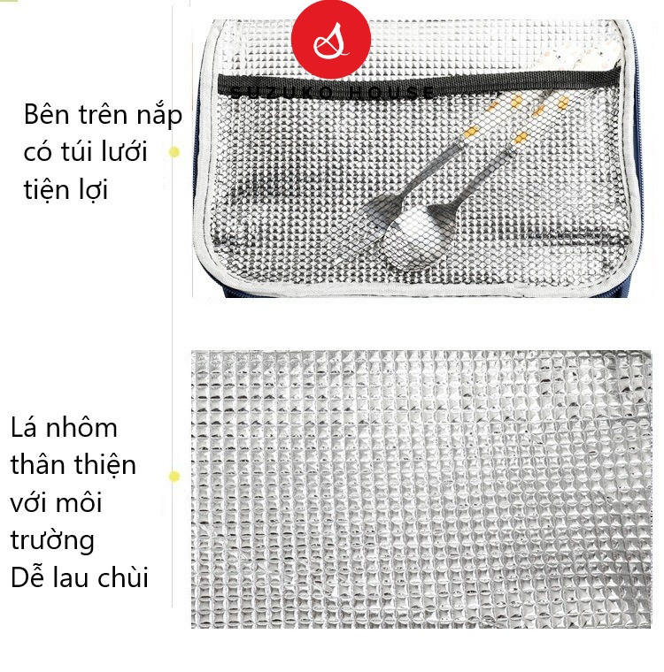 Lòng Túi cơm hộp giữ nhiệt rộng rãi bên trong có lớp giấy bạc và lớp cách nhiệt đủ dày, giúp giữ nhiệt độ thực phẩm tốt có thể đựng nước, thực phẩm mang đi làm.